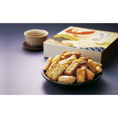 「京都朱雀あられ もちの園 LG-17P」 京都・朱雀で生まれたあられ「もちの園」。厳選されたもち米を使用し、すべての工程にこだわり抜いた生地を丹精込めて焼き上げた風味豊かな味わい。南方を守護する神鳥“朱雀”とともにお届けします。