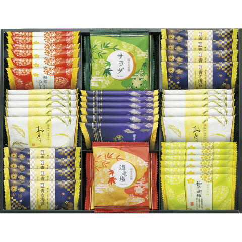 「おいしさいろいろ RGN-50R」 香り高い焼きのりを巻いたのり巻きあられや磯の香りひろがる青さ煎餅、柚子が香るスパイシーな柚子胡椒煎餅、海老とカレーが癖になる海老カレー煎餅、サクッとソフトなサラダ煎餅、焼き上げた海老が香ばしい厚焼きの海老塩煎餅など国産米100%にこだわった詰合せです。