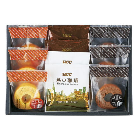 【数量・内容】バウムクーヘン(プレーン・ショコラ)各3・UCC ドリップカフェ(リッチブレンド・マイルドブレンド)7g×各2 【卵・乳成分・小麦】