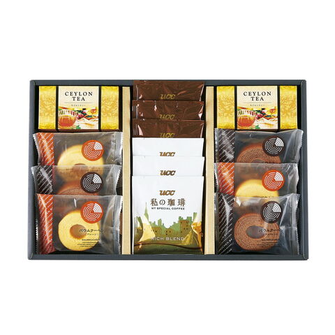【数量・内容】バウムクーヘン(プレーン・ショコラ)各3・UCC ドリップカフェ(リッチブレンド・マイルドブレンド)7g×各3・セイロンティ(BLACK TEA)2g×5袋×2 【卵・乳成分・小麦】