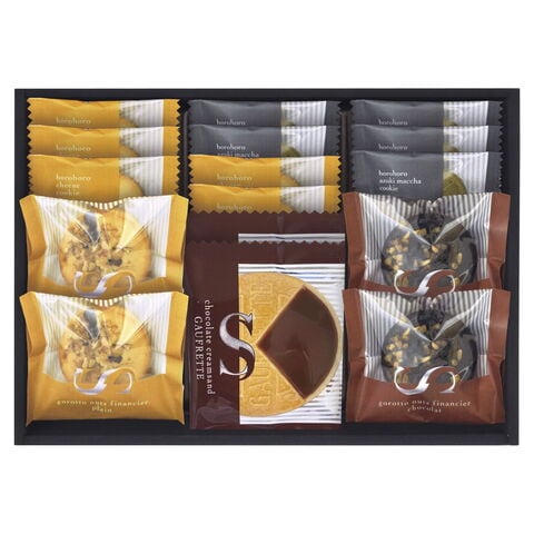 【数量・内容】ごろっとナッツフィナンシェ(バニラ・ショコラ)各2・ゴーフレット(チョコ)×2・ほろほろクッキー(チーズ・抹茶)各5 【卵・乳成分・小麦・くるみ】