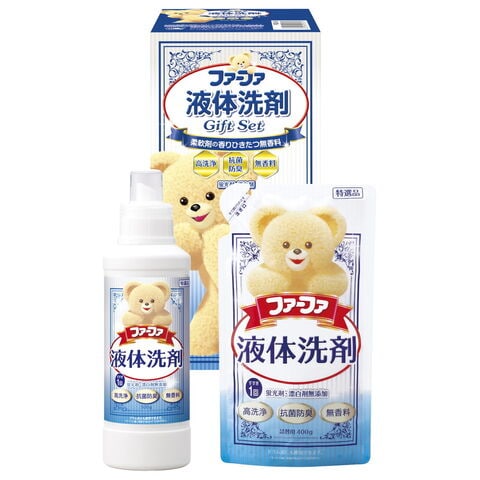 「ファーファ 液体洗剤セット FGS-15」 抗菌・防臭・高洗浄機能をプラスした柔軟剤の香りがひきたつ無香料液体洗剤。すすぎ1回で節水・節電・時短にもなるかわいいファーファの洗剤セットです。