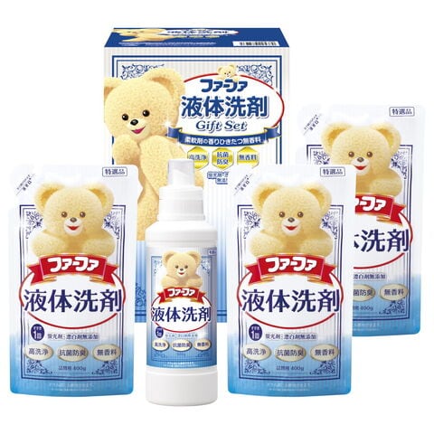 「ファーファ 液体洗剤セット FGS-25」 抗菌・防臭・高洗浄機能をプラスした柔軟剤の香りがひきたつ無香料液体洗剤。すすぎ1回で節水・節電・時短にもなるかわいいファーファの洗剤セットです。