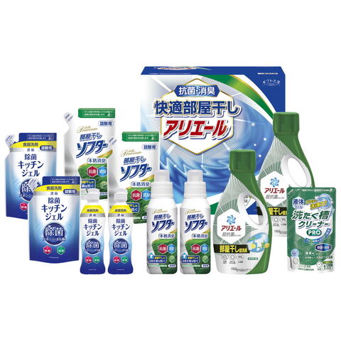 【数量・内容】アリエールジェル部屋干し超消臭700g×2・除菌キッチンジェル(本体200ml×2・詰替160ml×2)・抗菌部屋干しソフター(本体300g×2・詰替300g×2)・液体洗たく槽クリーナーPRO200g