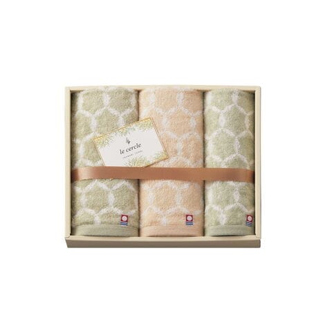 「ル・セルクル 今治産タオルセット LC4130」 シリーズ名「ル・セルクル」の“セルクル”は、フランス語で「円(サークル)」を意味します。「円(えん)」をくり返したデザインのタオルに人とのつながり、「縁(えん)」が末永く続きますように…という想いを込めました。