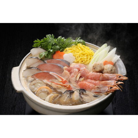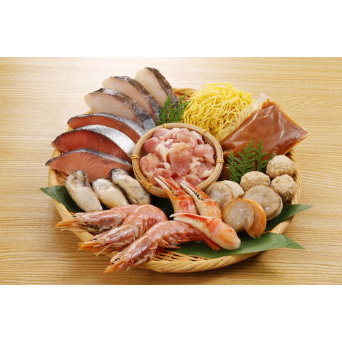 【数量・内容】秋鮭切身/3切(計90g)、たら切身/3切(計90g)、鶏もも肉/90g、ずわいがに爪・ボイル帆立・赤えび・牡蠣・とりごぼうつみれ/各3、ラーメン(生めん)/110g、特製あわせ味鍋スープ/140g