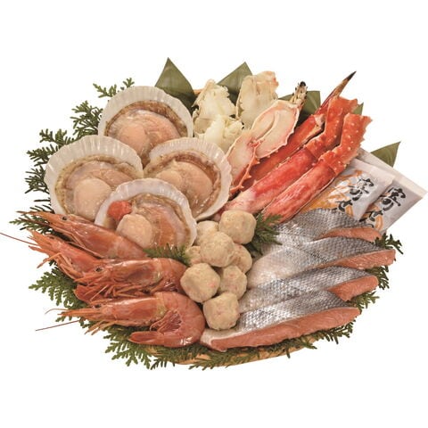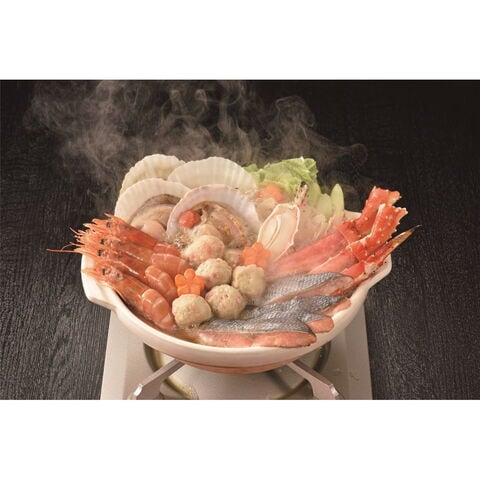 【数量・内容】ロシア産ボイルたらばがにハーフポーション/300g、北海道産ほたて片貝/4枚、アルゼンチン産赤えび/4尾、かにつみれ/8玉、北海道産秋鮭切身/40g×4、鍋用たれ(醤油味)/50g×2
