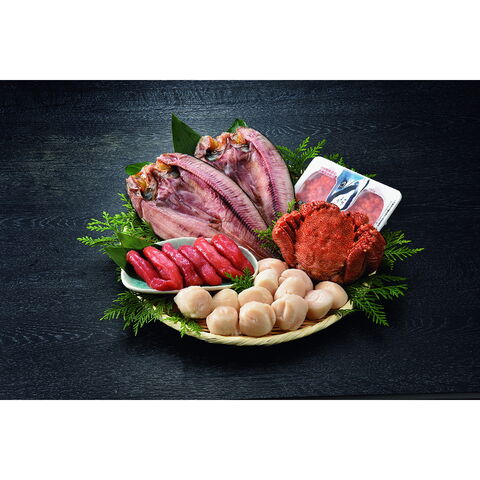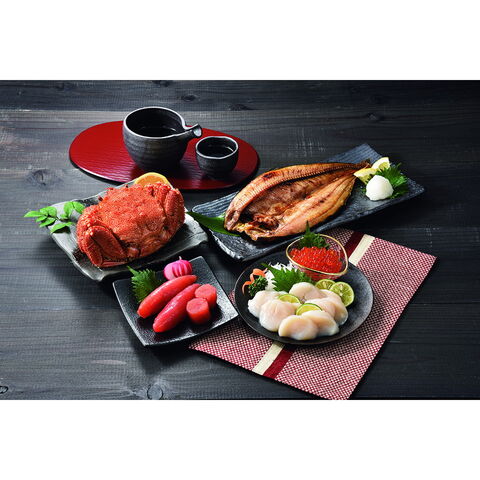 【数量・内容】北海道産毛がに/350g、北海道産真ほっけ/250g×2、北海道産いくら醤油味/100g、北海道産帆立貝柱/200g、北海道産たらこ/200g