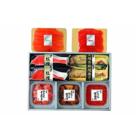【数量・内容】サーモントラウト燻製品・紅鮭燻製品・いくら醤油漬/各50g、あわびと数の子松前漬・辛子めんたいこ/各70g、銀鮭味噌漬・塩紅鮭/各2切