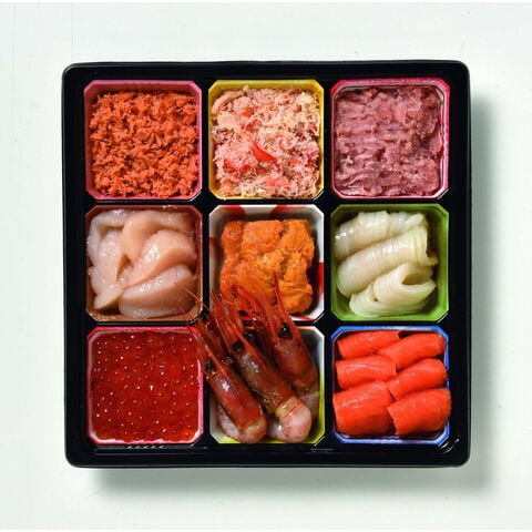 【数量・内容】いくら/40g、鮭ほぐし・うに/各20g、カニほぐし/25g、甘えび/3本、ネギトロ/45g、いか/35g、ほたて・サーモン/各6切