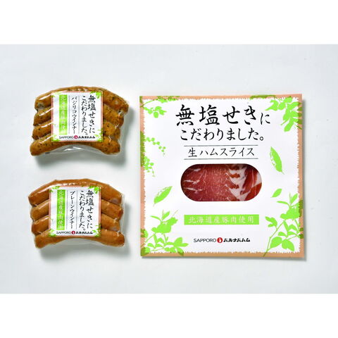 「札幌バルナバハム 北海道産無塩せきセット」 素材の美味しさを活かした無塩せきのセットです。発色剤を使用せずに、塩・砂糖・香辛料などを使用して仕上げました。