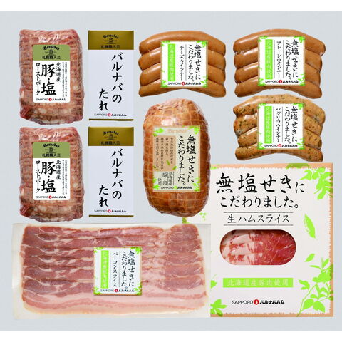 「札幌バルナバハム 北海道産無塩せきセット」 発色剤を使用していないハム・ベーコン・ソーセージ・ローストポークのギフトです。
