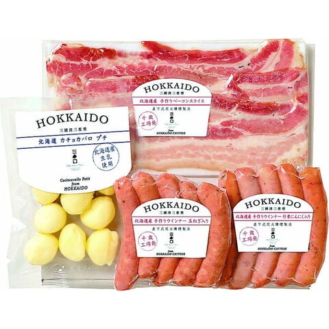 【数量・内容】三國推奨北海道産手作りウインナー(玉ねぎ入り・行者にんにく入り)/各110g、三國推奨北海道産手作りベーコンスライス/70g、三國推奨北海道カチョカバロプチ/88g