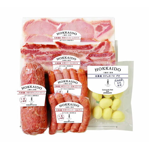 【数量・内容】三國推奨北海道産手作りウインナー(玉ねぎ入り・行者にんにく入り)/各110g、三國推奨北海道産手作りベーコンスライス/70g、三國推奨北海道産手作りロースハムスライス/80g、三國推奨北海道産手作りボロニアソーセージ/400g、三國推奨北海道カチョカバロプチ/88g