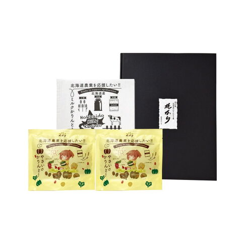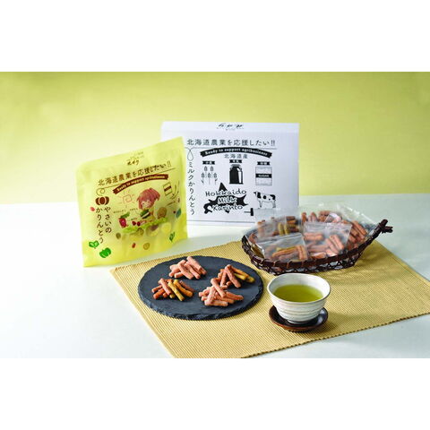 「三葉製菓 【北海道農業を応援したい!!】北海道ミルクかりんとう&やさいのかりんとうセット」 「北海道農業を応援したい!!」との思いから北海道産の素材にこだわり、やさしい美味しさに仕上げたかりんとうのセットです。