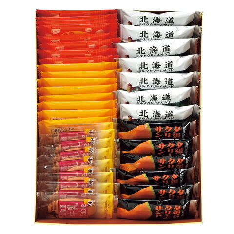 【数量・内容】じゃがバタークッキー・ポテっとチーズ・牛乳サブレ/各8枚、北海道ミルククリームサンド/7枚、夕張メロンクリームサンド/6枚