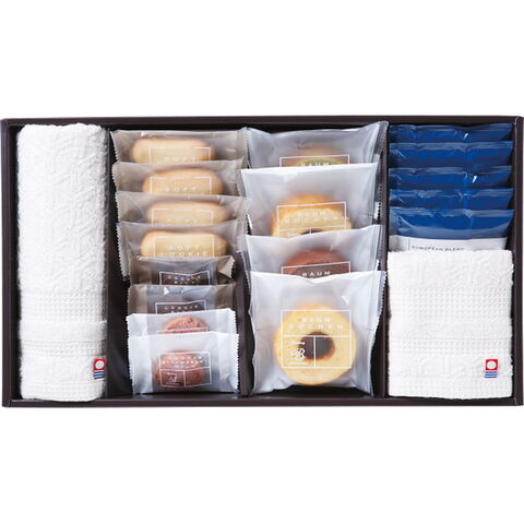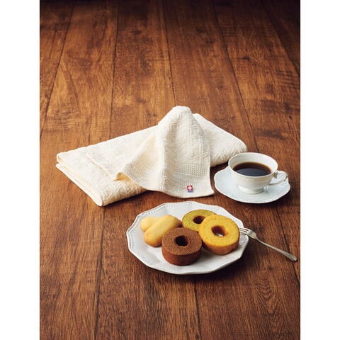 【数量・内容】今治産フェイスタオル(約34×75cm・綿100%・日本製)1枚・ウォッシュタオル(約34×35cm・綿100%・日本製)1枚・ミニバウム(バニラ×2・チョコ×1・抹茶×1)・ソフトクッキー×4・クッキー(いちごミルク×2・ココア×2)・ドリップコーヒー8g×5