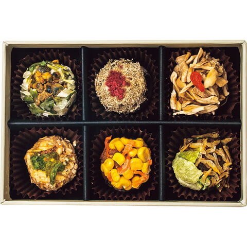 【数量・内容】みそ玉(紫[鉄]:玄米味噌、黒豆味噌使用・緑[葉酸]:加賀味噌、黒豆味噌使用・水[ビタミンB1]:北海道味噌、九州麦味噌使用・黒[マグネシウム]:信州味噌、ひよこ豆味噌使用・橙[ビタミンD]:仙台味噌、玄米味噌使用・灰[亜鉛]:信州味噌、八丁味噌使用×各1)