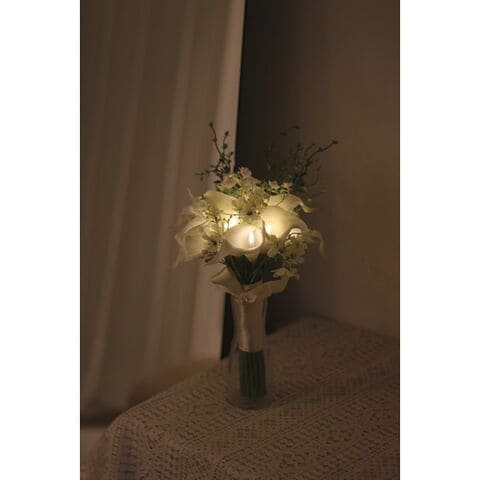 「ロマンティックブーケLED ホワイト」 ひとつひとつ手仕事により丁寧に作られた本物のようなお花をモチーフにしたフラワーLED。昼はインテリアとして、夜はライトをつけて癒しの時間をお楽しみいただけるムードライトです。