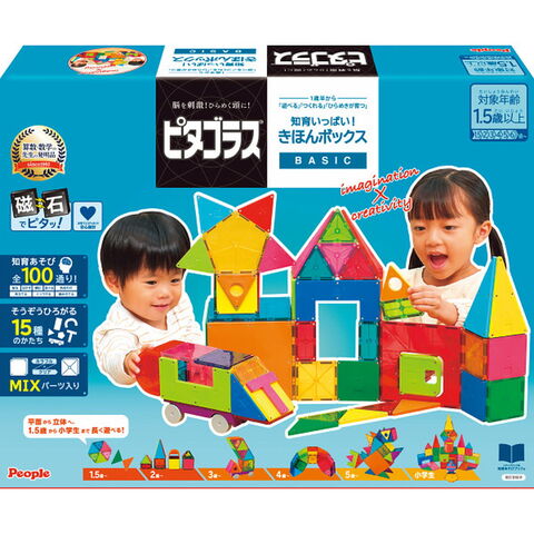 「ピープル ピタゴラスBASIC 知育いっぱい!きほんボックス」 磁石の力で「あそべる!」「つくれる!」「ひらめき」が育つ!あそび・形・色の3つの「きほん」がそろった、ピタゴラスの定番セットです。