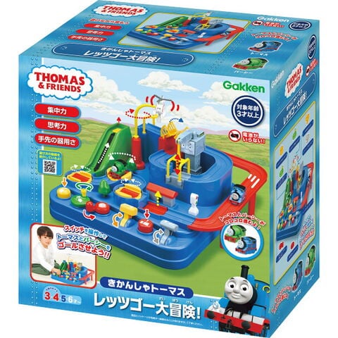 「きかんしゃトーマス レッツゴー大冒険!」 大好きなトーマスやパーシーと一緒に大冒険に出かけよう!電池を使わずに「回す」「押す」「引く」などレバーを使った手指の運動が手先の器用さを伸ばします。トーマスたちを思い通りに走らせるため試行錯誤することで、集中力や知覚力・認識力を育みます。