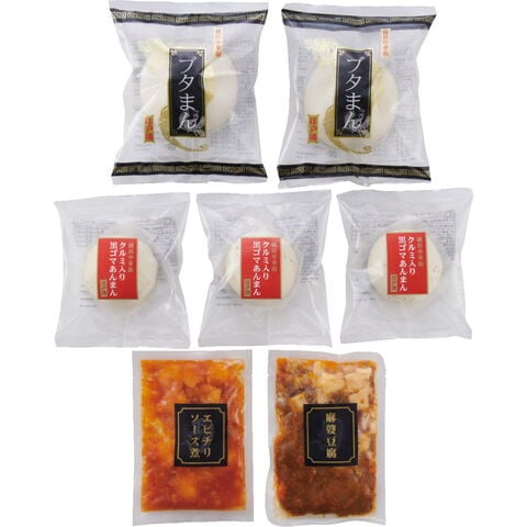 【数量・内容】ブタまん250g×2、クルミ入り黒ゴマあんまん100g×3、エビチリソース煮170g・麻婆豆腐170g×各1