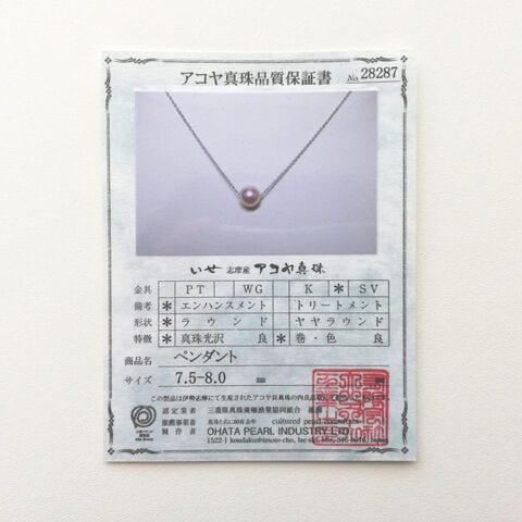 【数量・内容】アコヤ真珠ペンダント7.5~8.0mm(スライド式チェーン45cm)、専用ケース、保証書