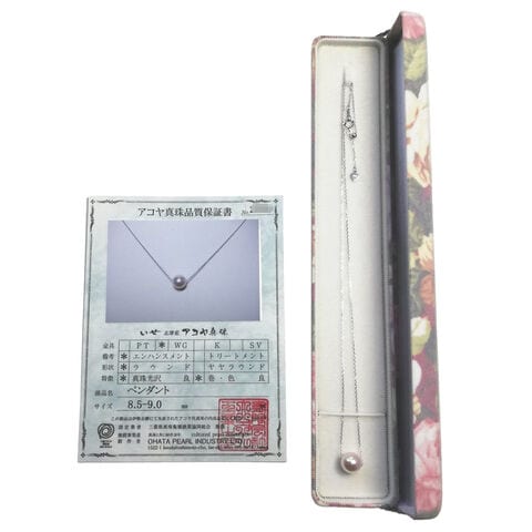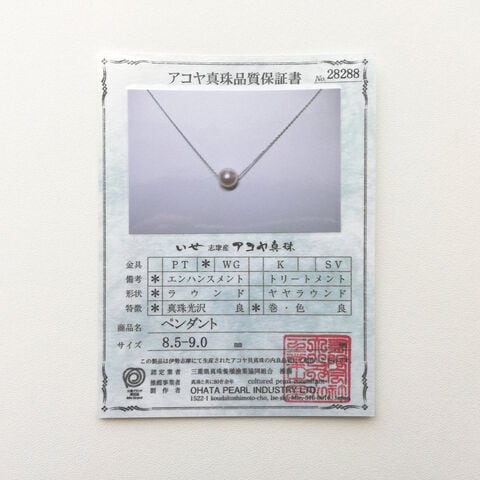 【数量・内容】アコヤ真珠ペンダント8.5~9.0mm(スライド式チェーン45cm)、専用ケース、保証書