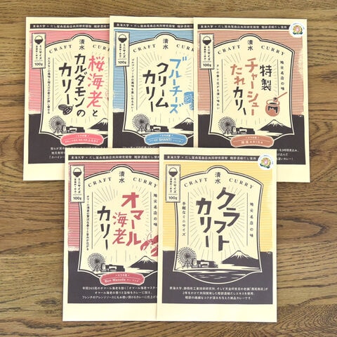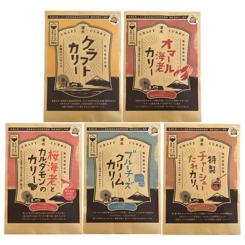 東海大学と静岡県工業技術研究所と西尾商店が2年かけて共同研究開発した鰹節濃縮だしエキスを使用した「西尾商店 清水クラフトカリー レトルトカレー 食べ比べセット」です。こだわりの鰹節濃縮だしエキスを使用し、静岡市清水のランドマークで知られるエスパルスドリームプラザ(通称ドリプラ)の『はとばキッチン』で人気のカレーをさらに美味しく仕上げました。さらに、「清水を”美味しい”で笑顔に、元気に」をキャッチフレーズに集う4つの飲食店が、このクラフトベースカレーにアレンジを加えました。それぞれの個性が光る5種類(クラフトベースカリー・オマール海老カリー・ブルーチーズクリームカリー・桜海老とカルダモンのカリー・特製チャーシューたれカリー)の美味しいカレーをお楽しみください。ご飯のお供、食卓のおかずなどとして、温めるだけで手軽にお召し上がりいただけます。