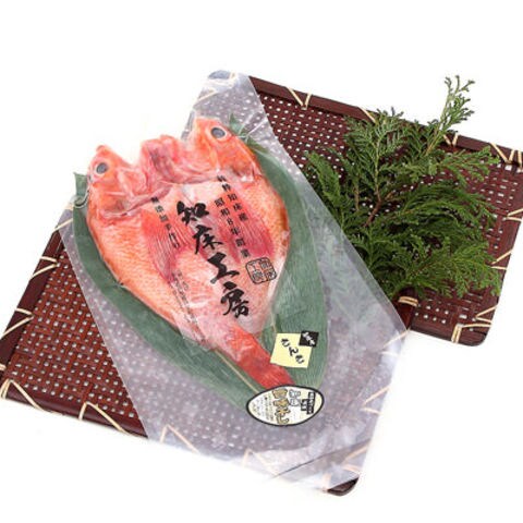 【脂ののり、身のやわらかさ納得の一夜干し】北海道知床、斜里魚菜卸売市場で競り落とした、とれたてで鮮度のよいきんきの一夜干しです。近年漁獲量が極端に減少してきたお魚で、「きんき」「めんめ」「きちじ・吉次」とも呼ばれています。北海道ではお正月に鯛のかわりによくこの「きんき」が食卓に上がります。お祝いの魚というイメージが高く、またその魚体の色も鮮明な赤(特に生魚)です。とれたてのきんきを生魚のまま塩水処理し一夜干しにしました(生干し)。一夜干しによって水分を減らしうまみが凝縮するうえ、ゆったりとした乾燥の間に魚のたんぱく質がアミノ酸に変化して旨みも風味も加わります。長時間干すことは知床の冷涼な気候だから成しえる旨味干です。生干しにしたあと風味を損なわないうちにすぐに真空包装をして旨味を閉じ込めました。冷蔵庫で自然解凍後焼き魚としてお召しあがりください。焼き面にアルミホイルを一枚差し込むと皮まで焦がさず上手に焼きあがり皮まで召しあがれます。こちらは生で550g以上あった特大サイズです。