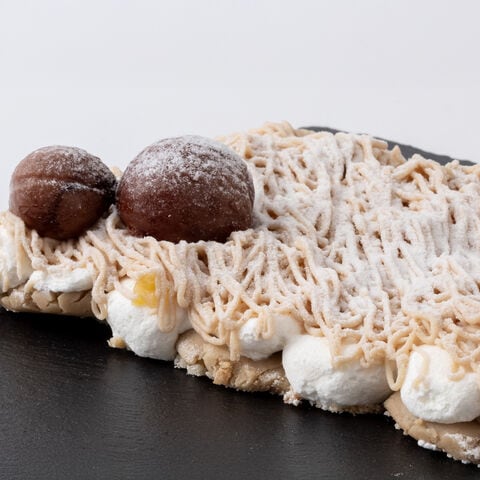 【原材料】蒸し栗ペースト(栗、砂糖)(国内製造)、乳等を主要原料とする食品(植物油脂、クリーム、バターオイル、その他)、栗渋皮付甘露煮(栗、砂糖)、栗甘露煮(砂糖、栗、むき栗)、マロンクリーム(栗、砂糖、グルコースシロップ、その他)、マーガリン、小麦粉、砂糖、洋酒、粉糖、卵黄、食塩/香料、乳化剤、ステアリン酸Ca、加工デンプン、pH調整剤、リン酸Ca、酸化防止剤(ビタミンC、V.E)、増粘多糖類、着色料(クチナシ色素)、カラメル、(一部に小麦・卵・乳成分・大豆を含む)