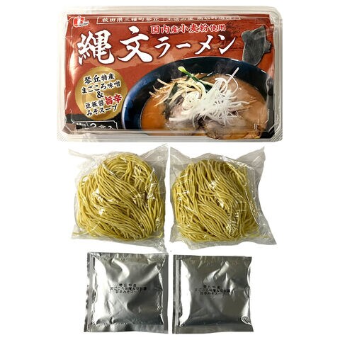 秋田県三種町(みたねちょう)の泉製麺所がお届けする「縄文ラーメン」です。縄文時代の高石野遺跡(たかいしのいせき)から出土した土笛(つちぶえ)で知られる三種町琴丘(ことおか)産のそら豆を原料とした味噌と豆板醤ををブレンドした旨辛味噌スープが特徴です。旨みのあるスープが、国産小麦使用の自家製ストレート麺とマッチ。ランチ、夜食、〆の一杯などとして、お取り寄せでお楽しみください。トッピング具材には、もやし、豚肉、ニラなどがおすすめです。麺の茹で時間、スープの濃さはお好みで調整してください。