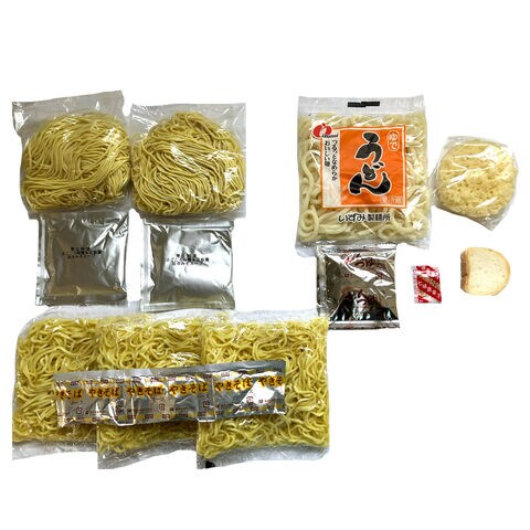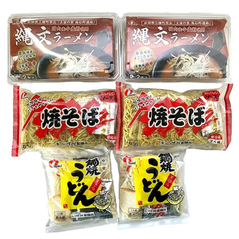 【数量・内容】鍋焼きうどん(めん200g×1、スープ35g×1、天ぷら15g×1、焼麩3g×1、唐辛子2g×1)、焼きそば(150g×3、ソース9.6g×3)、縄文ラーメン(めん150g×2、スープ65g×2) 各2