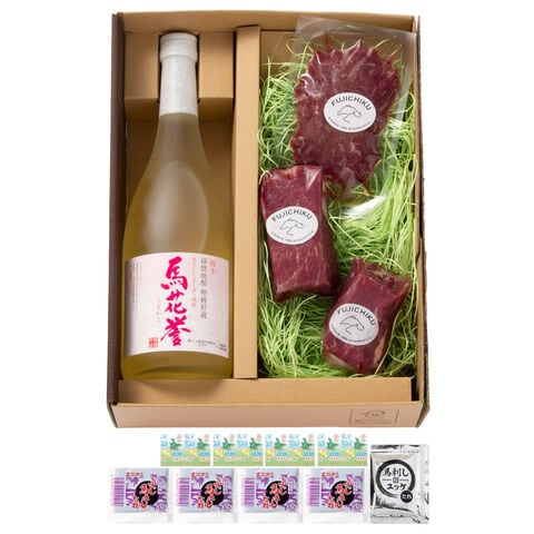 【数量・内容】上赤身80g×2、ユッケ50g×1、馬刺しのたれ5ml×4、しょうが3g×4、ユッケのたれ10g×1、本格米焼酎馬花誉720ml×1