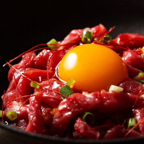 【原材料】<ユッケ>馬肉(カナダ産(熊本肥育)、フランス産(熊本肥育)、国産のいずれか)