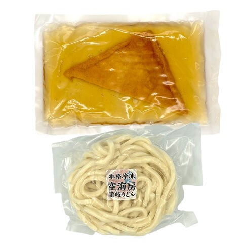 1日平均400人の香川県民が来店する「讃岐うどん 空海房(くうかいぼう)」で人気上位を誇る「きつねうどん 冷凍」です。希少天然還元水”空海の泉”を使い、しっかりと出汁をとりました。うまみたっぷりのかけ出汁に、甘辛く煮た油揚げを乗せた逸品です。電子レンジで温めるだけの簡単調理で、いつでもどこでも手軽にお召し上がりいただけます。お好みで薬味を加えてお召し上がりください。