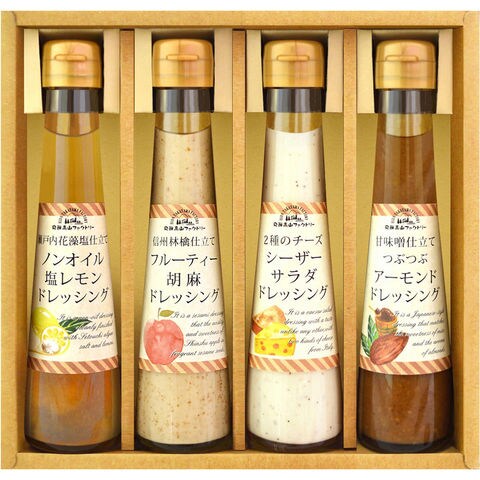 【自然素材の味を生かした身体にやさしいドレッシングセット】ひとつひとつ丁寧に造り上げたオリジナルドレッシング『~食菜味~すこやかドレッシングギフト』です。爽やかな酸味のレモンとまろやかな塩味が特徴の瀬戸内の花藻塩を使ってさっぱりと仕上げた「瀬戸内花藻塩仕立てノンオイル塩レモンドレッシング」、香ばしいゴマの中に信州りんごの酸味と甘みがほのかに香る「信州林檎仕立てフルーティー胡麻ドレッシング」、2種のチーズとニンニクでつくったまろやかなコクと豊かな風味の「2種のイタリアンチーズシーザーサラダドレッシング」、味噌の優しい甘さとアーモンドの香ばしさがマッチした「甘味噌仕立てつぶつぶアーモンドドレッシング」の4種類を詰め合わせました。それぞれ個性豊かな特長があり、サラダ以外にもさまざまなお料理にお使いいただけます。素材の旨味をそのままギュッと凝縮させ、丁寧につくられたドレッシングは、毎日の食卓に安心してお使いいただけます。普段のドレッシングとは一味も二味も違う革新的なドレッシングです。ぜひ一度お試しください。