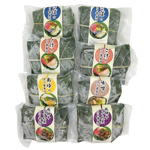 【数量・内容】飛騨牛しぐれ煮ほうば寿司72g×2、さけのほうば寿司70g×2、さばのほうば寿司72g×2、あゆのほうば寿司70g×1、飛騨牛入り味噌のほうば寿司75g×1