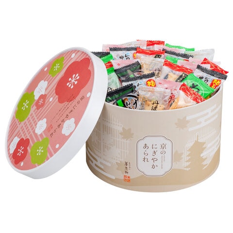 和をイメージしたかわいいパッケージに、いろいろな味のあられをいっぱい詰め込んだ「京都 養老軒 京のにぎやかあられ ギフトボックス」です。伊勢海老、黒豆、わさび、梅、柚子塩こうじ、九条ねぎみそなど、バラエティ豊かなフレーバを食べ比べてお楽しみください。ご家族やご友人で楽しめる、にぎやかなセットです。おやつ、お茶請け、おつまみなどにおすすめです。化粧箱に入れてお届けしますので、手土産、贈答、ギフト、プレゼントなどにもご利用ください。
