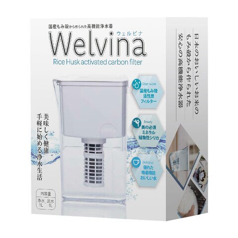 「Welvina ピッチャー型浄水器 カートリッジ付き」は、もみ殻活性炭フィルターを使用した、家庭用のコンパクトな浄水器です。片手でもちやすく、冷蔵庫のドアポケットにもぴったり収まるサイズです。もみ殻活性炭フィルターは、原材料に国内産のお米のもみ殻を100%使用しています。もみ殻にはシリカ(ケイ素)が多く含まれています。また、もみ殻活性炭は多孔質なため、水中の様々な大きさの分子を吸着できるのが特徴です。この特有の多孔質とシリカの含有により、とてもおいしい水を作ることができます。口当たりはとてもまろやかで、お茶やコーヒーはもちろんのこと、水割りでもおいしさを実感していただけます。ご家庭の水道水から手軽に作れるので、毎日のお料理や炊飯にもおすすめです。