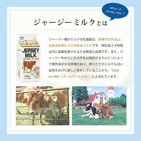 ジャージー種のミルクの乳脂肪は、冬場5.0%以上もある非常にコクがあるミルクです。搾乳後24時間以内に殺菌処理されるため鮮度も良いです。ジャージー牛からとれる牛乳は脂肪がβカロチンによって黄色味がかかる特徴があり、搾りたてのミルクも淡い金色をおびた美しい色をしていることから、‘‘Golden-Milk(ゴールデンミルク)‘‘と呼ばれています。
