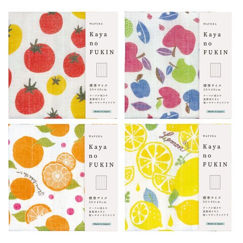 毛羽立ちが少なく、食器やガラスのコップなどをきれいに拭ける「かや生地ふきん Kaya no FUKIN」です。綿と天然パルプ由来のレーヨンを縫い合わせており、使うほどふんわり柔らかくなります。カラフルな色使いでおしゃれな4柄(トマト・アップル・オレンジ・レモン)をセットでお届けします。
