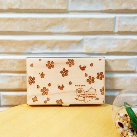 群馬県のゆるキャラ「ぐんまちゃん」を中心に、桜の花びらや折り鶴、群馬県の形をデザインしました。木材の温かみを感じる名刺ケースです。ふたが大きく開くので中身を取り出しやすいです。フレームにはステンレス素材を使うことで耐久性を高めました。内側の素材も傷が付きにくいものを使用しています。 自分用にはもちろん、群馬にゆかりがある人へのプレゼントとしても最適です。ほっこりとしたデザインで気持ちが和む一品です。