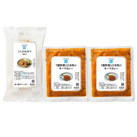 「RFFFルフフフ キーマカレー&ヒレカツセット」は、7種の野菜が入った、からだ想いのキーマカレーとミニサイズのヒレカツ4個入りのセットです。日常の食卓に使いやすいRFFFルフフフの人気商品を詰め合わせました。