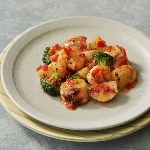 【原材料】帆立(北海道)、じゃがいも(国産)、調味海老、植物油脂、ブロッコリー、パプリカ、還元水あめ、食塩、にんにく、醤油、香辛料/pH調整剤、トレハロース、増粘剤(加工デンプン)、調味料(アミノ酸)、(一部に小麦・えび・大豆を含む)