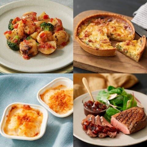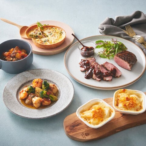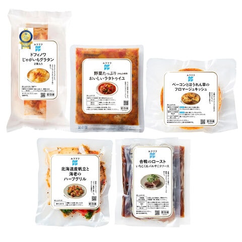 【数量・内容】ドフィノワじゃがいもグラタン2個入り200g、野菜たっぷり200g分使用 おいしいラタトゥイユ180g、ベーコンとほうれん草のフロマージュキッシュ160g、北海道産帆立と海老のハーブグリル150g、合鴨のローストいちじく&バルサミコソース220g