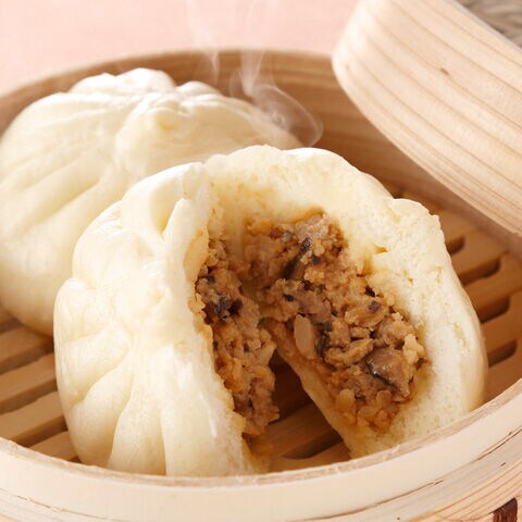 <手包み肉まん>豚肉、玉ねぎを大きめにカットし、小籠包のような肉汁たっぷりのジューシーな具材が入った、約120gのサイズのボリュームのある肉まんです。皮はオリジナル配合の小麦粉を練り上げた皮だけを一次発酵、具を包んでから二次発酵を行っていますので、ふんわりした食感が楽しめます。