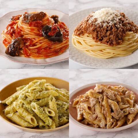 【数量・内容】アラビアータソースのマルゲリータ240g、ジェノベーゼソースのピッツァ235g、なすのトマトソース180g、ミートソース155g、ペンネジェノベーゼ150g、ポルチーニのクリームペンネ140g