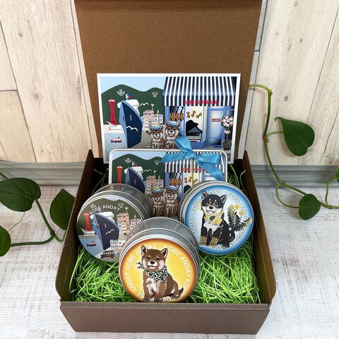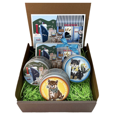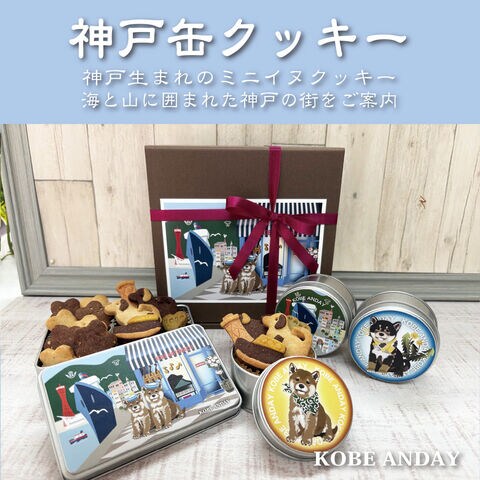 神戸アンディの「クッキー缶セット シバ犬柄」です。クッキーが入った3種類の缶(角缶1個、丸缶3個)とポストカードのセットでお届けします。神戸生まれのアンディのワンちゃんが、大好きな神戸の海・山・街を案内します。化粧箱に入れてお届けしますので、犬が好きな方へのギフトやプレゼントなどにもご利用ください。