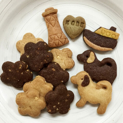 <ミニクッキー>小麦粉、バター、卵、砂糖(てんさい糖)、ココア/香料、着色料(クチナシ、紅花黄、ビートレッド)